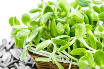 Sunflower sprouts are loaded with vitamin D and have a nice, rich flavor. Clover green sprouts are sweet and crisp; they are great for sandwiches and salads. Radish sprouts are very high in vitamin C and vitamin A, with a spicy taste. Mustard sprouts are very hot and spicy and go well in dishes as well as salads. Pea shoots are a great source of three chemo-protective agents: folate, antioxidants, and carotene, which help protect cells against DNA damage. Sprouted grains such as brown rice and buckwheat can be added to bread to provide a crunchy texture.